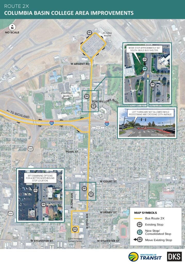 **** Area 2 – Columbia Basin College includes improvements to the stop on 20th Avenue at Sun Willows Boulevard: the southbound bus stop will be moved closer to the intersection and see a new bus shelter built; based on crash history, the intersection’s signal timing will be changed to prevent conflicts between pedestrians crossing 20th Avenue and vehicles turning left onto 20th Avenue.